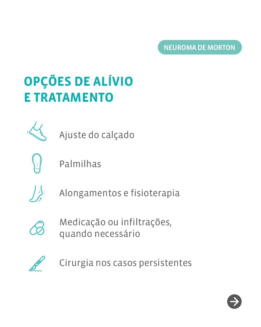In cases where conservative treatment is ineffective and pain remains limiting, surgery may be indicated. The surgical procedure involves releasing the nerve from the fibrous structures compressing it and, often, removing it. This is a short procedure, usually performed on a day-case basis, with a high success rate. As a possible consequence, partial loss of sensation in the affected toes may occur.