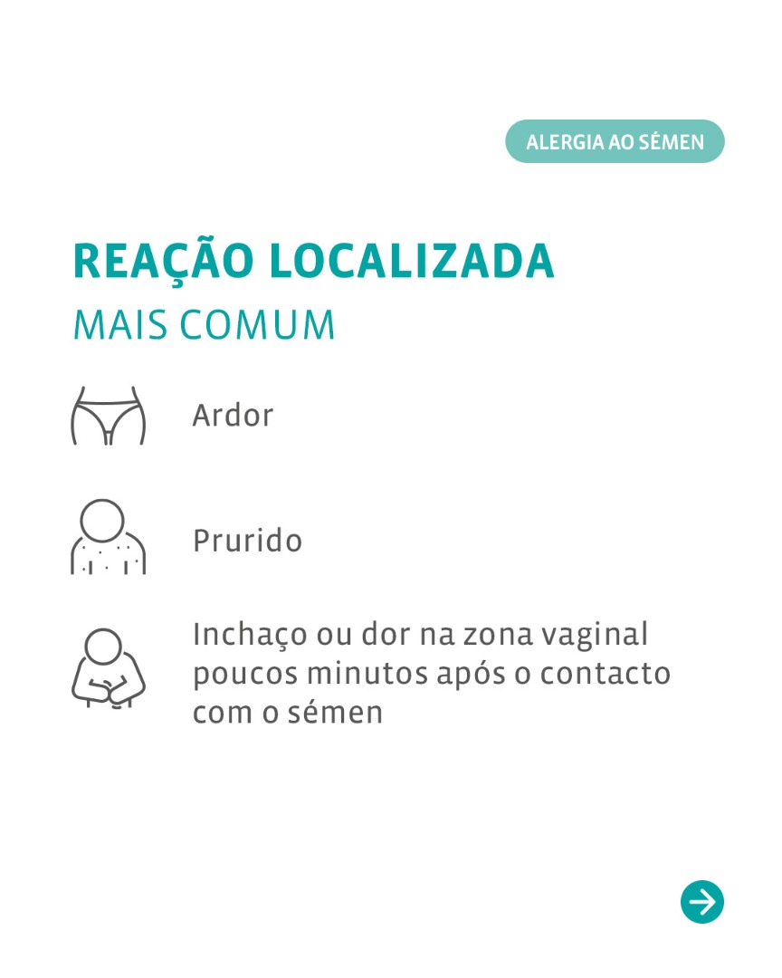 A mais frequente, é uma reação localizada, que provoca ardor, prurido, inchaço ou dor na zona vaginal poucos minutos após o contacto com sémen. A segunda, menos frequente, é uma reação sistémica, que pode causar urticária (manchas pruriginosas), inchaço, pieira, dificuldade em respirar, náuseas ou até anafilaxia. Em ambos os casos, os sintomas desaparecem completamente com a utilização de preservativo. Essa trata-se de uma pista importante de que as proteínas seminais são as responsáveis pelo quadro.