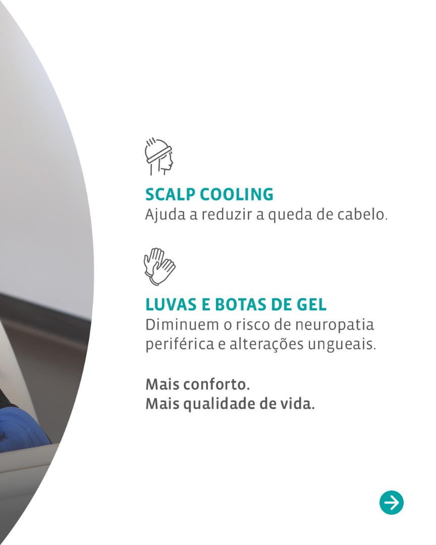 - Crioterapia periférica (luvas e botas de gel):aplicada nas mãos e pés, 15 a 30 minutos antes do início da infusão da quimioterapia, durante, e mantida até 30 minutos após o seu término.