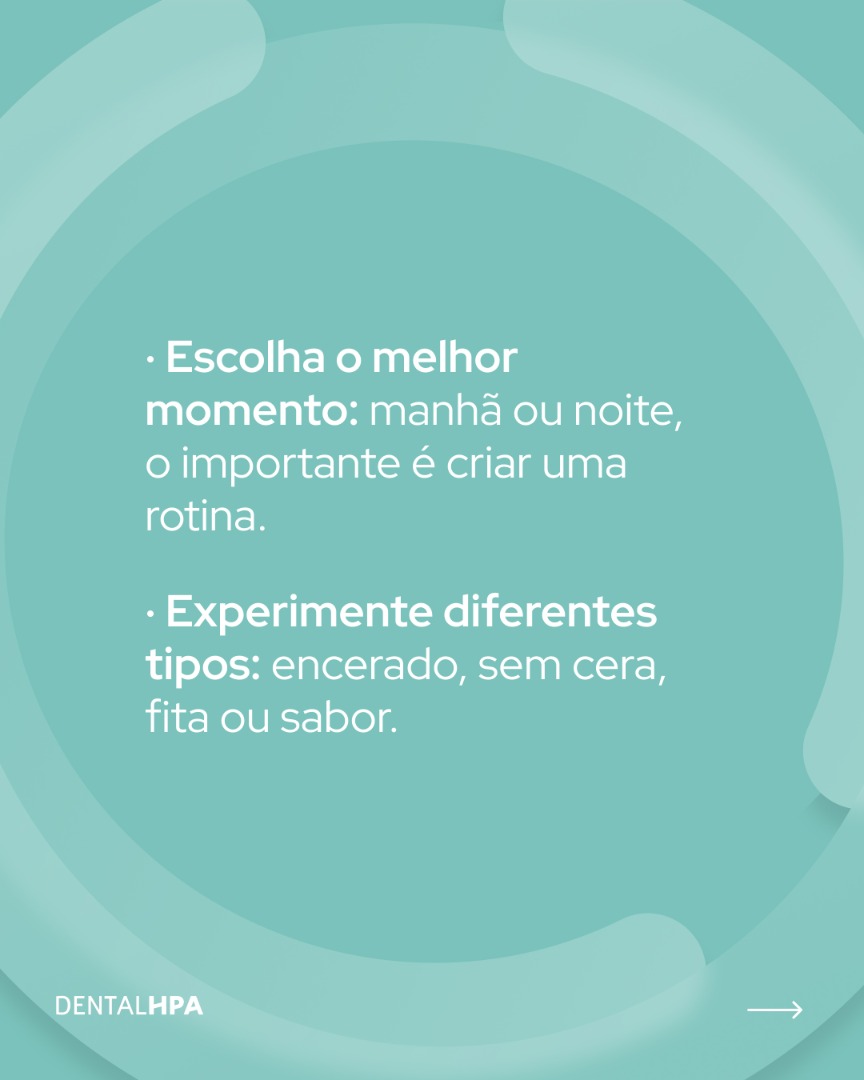 - Experimentar diferentes tipos de fio: encerado, sem cera, fita dental ou fio com sabor. Cada opção desliza de forma diferente entre os dentes.