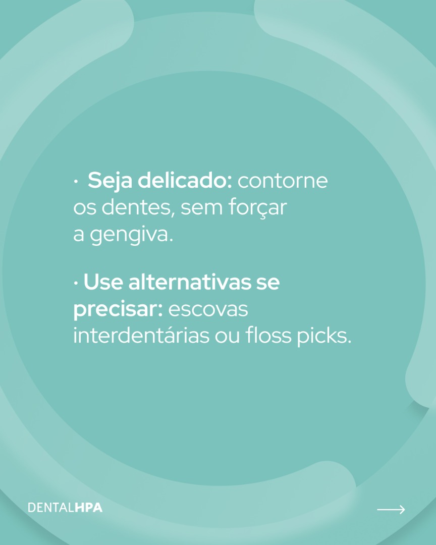 - Ser delicado: o fio deve contornar o dente, nunca ser forçado contra a gengiva. Se houver algum sangramento inicial, isso pode indicar gengiva sensível à placa acumulada, situação que tende a melhorar com o hábito.
