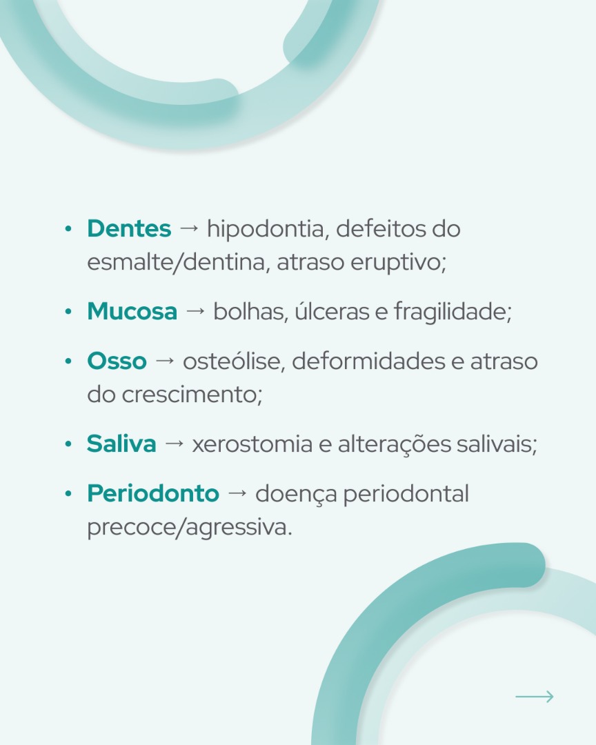 A epidermólise bolhosa caracteriza-se por uma extrema fragilidade da pele e das mucosas. Na cavidade oral, observam-se frequentemente bolhas recorrentes, erosões dolorosas, microstomia (abertura da cavidade oral anormalmente pequena), anquiloglossia (condição em que o freio lingual é curto e afeta os movimentos da língua) e elevado risco de desenvolvimento de cáries dentárias, em grande parte devido à dificuldade na realização de uma higiene oral adequada.
