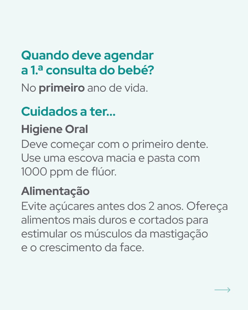 Sabia que a primeira consulta de Medicina Dentária deve realizar-se durante o primeiro ano de vida do seu bebé? Muitos pais continuam a acreditar que a primeira visita ao dentista deve acontecer apenas por volta dos 4 anos, mas a realidade é que esta deve ser feita antes da criança saber andar ou falar. Basta que tenha erupcionado o primeiro dente de leite.